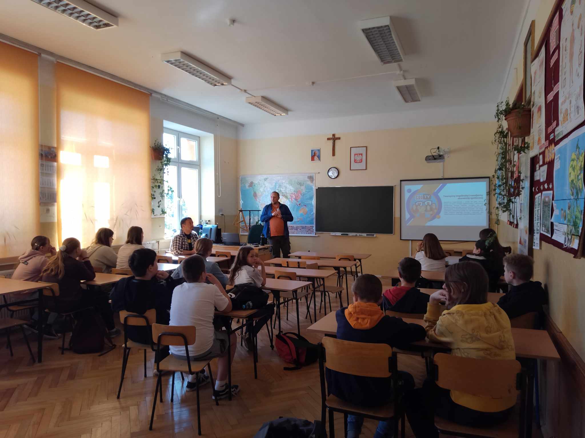 Prowadzący warsztaty omawia temat animacji społeczności lokalnych, stojąc przed grupą uczestników siedzących w kręgu. W tle wyświetlany jest slajd z prezentacji, a w pomieszczeniu widoczne są flagi Polski i Unii Europejskiej.