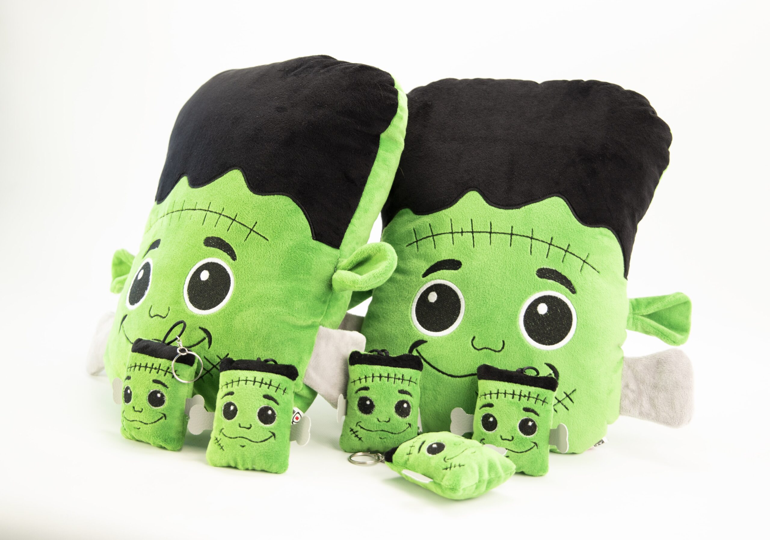 Różnorodne pluszowe zabawki stworzone przez Fundację GraTy, w tym urocze warzywa, owoce i inne zabawne postacie, wyeksponowane na niebieskim tle.
